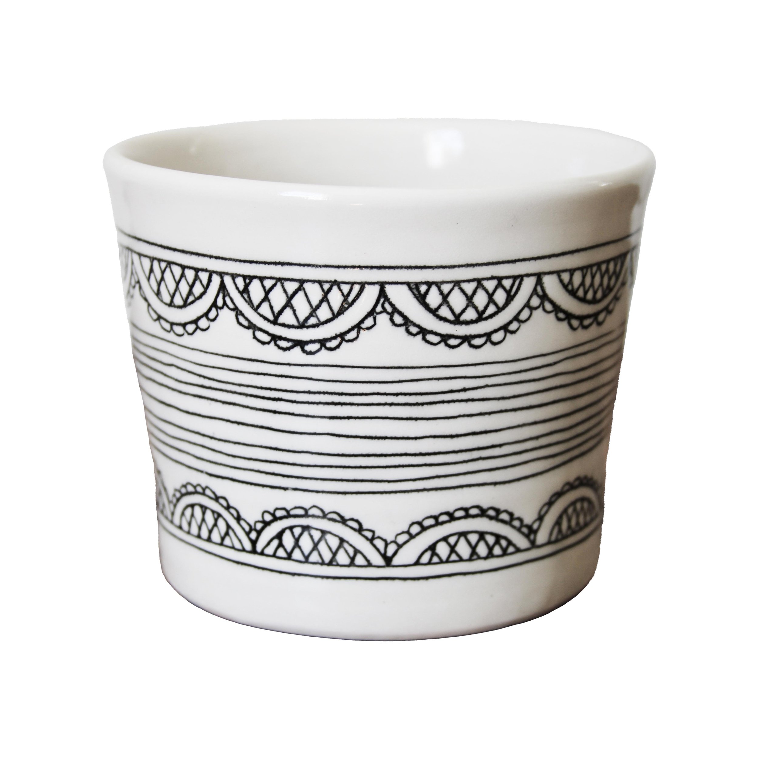 Handmade porcelain cache pot with hand drawn illustrations.